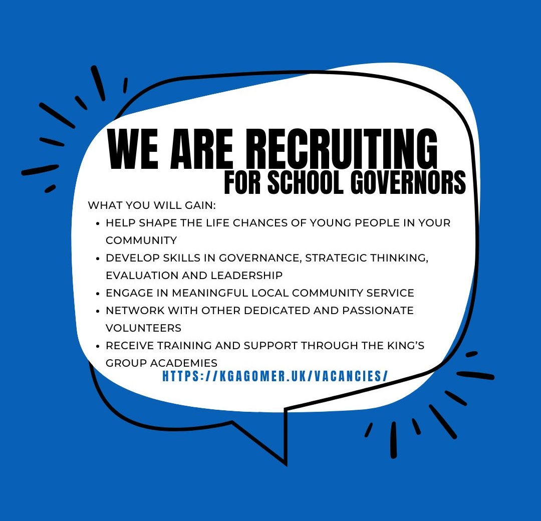 Do you care about shaping young lives and want to make a difference in your local community? Have some time and energy to spare? If so, we would love to hear from you because Governance is one of the most rewarding ways to make a tangible difference and build your own capabilities. Why join us? At King’s Academy Gomer, we’re proud of our r ...